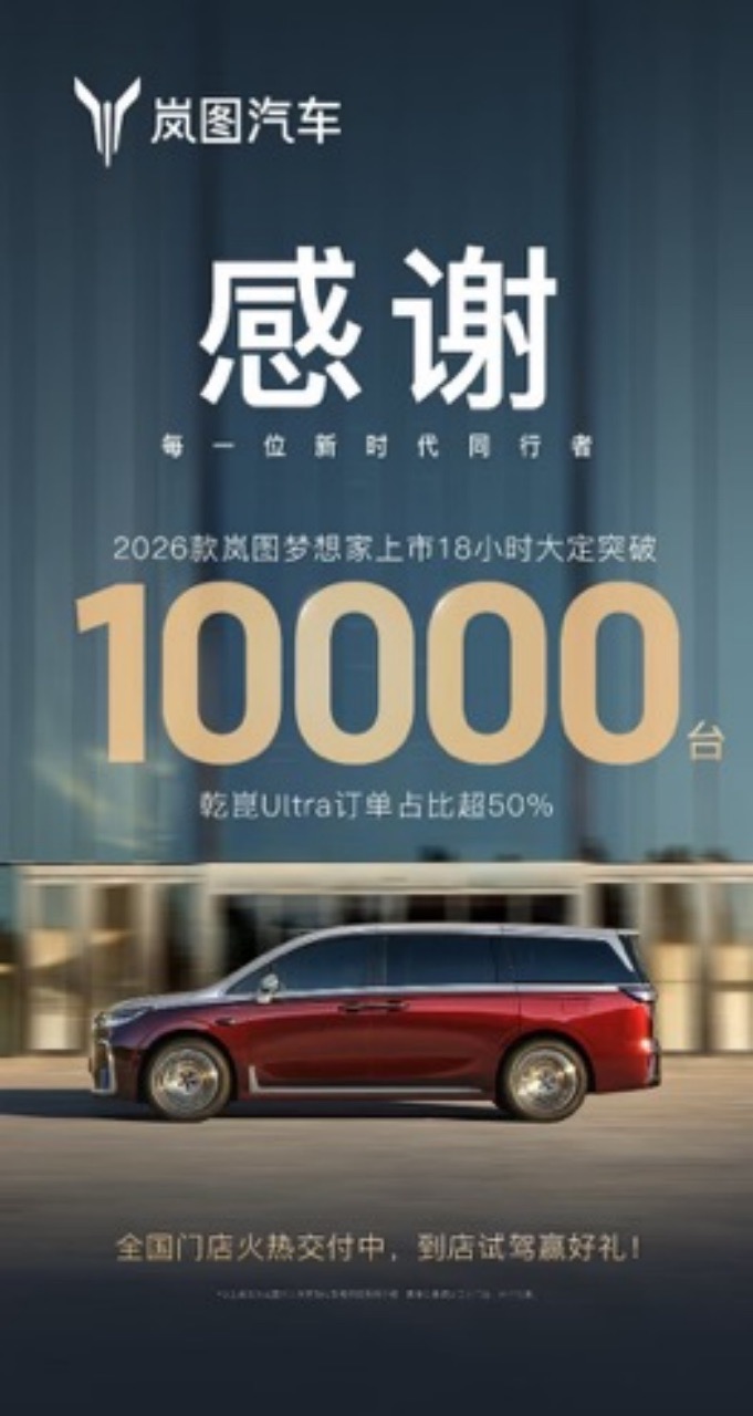 作为高端MPV市场的现象级产品,岚图梦想家6-8月,连续三个月蝉联新能源MPV月度销冠,累计交付已突破13万辆,单车均价达39万元,成为高净值用户的首选。9月15日,“新时代旗舰MPV”2026款岚图梦想家焕新上市,推出鲲鹏与乾崑两大智能系列,涵盖PHEV与EV双动力模式,官方指导价32.99万元至43.99万元。作为全球首款800V智能超混MPV,该车首搭岚海智能超混技术,并集成800V高压平台、5C超充、62.5度大电池、华为ADS 4.0、鸿蒙座舱5.0及智能后轮转向等顶级配置,一举解决高端MPV在纯电续航、补能效率、空间操控与智能豪华之间的核心痛点。上市18小时订单突破10000辆,再次印证其产品实力与市场号召力。