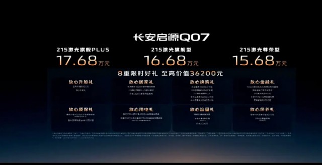 日前,长安启源Q07天枢智能驾驶辅助激光版正式上市,新车共推出3款配置车型,售价区间为15.68万至17.68万元。激光版车型将配备激光雷达,支持更高阶的辅助驾驶功能。