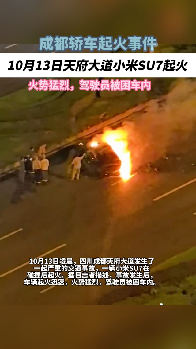 10月13日凌晨,四川成都天府大道发生了一起严重的交通事故,一辆小米SU7在碰撞后起火。据目击者描述,事故发生后,车辆起火迅速,火势猛烈,驾驶员被困车内。尽管多名路过司机尝试破窗救援,但未能成功。消防人员随后赶到现场,使用水枪和消防泡沫扑灭了明火,并切割车门进行救援,但车内人员的具体状况尚未明确。