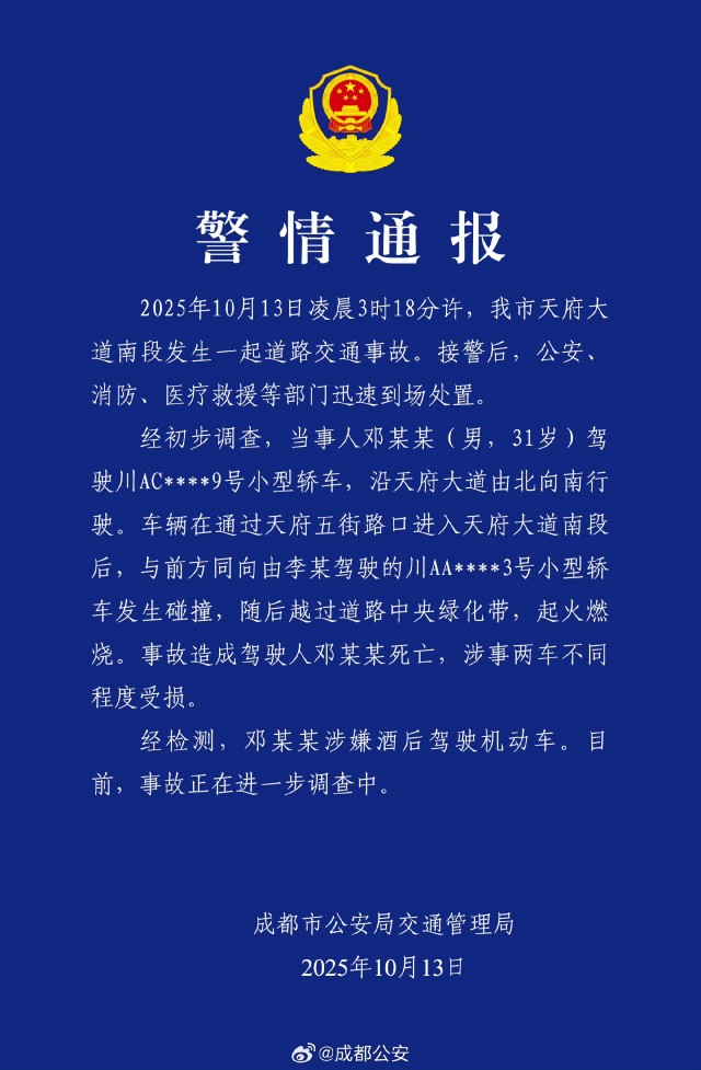 原文如下:2025年10月13日凌晨3时18分许,我市天府大道南段发生一起道路交通事故。接警后,公安、消防、医疗救援等部门迅速到场处置。 经初步调查,当事人邓某某(男,31岁)驾驶川AC****9号小型轿车,沿天府大道由北向南行驶。车辆在通过天府五街路口进入天府大道南段后,与前方同向由李某驾驶的川AA****3号小型轿车发生碰撞,随后越过道路中央绿化带,起火燃烧。事故造成驾驶人邓某某死亡,涉事两车不同程度受损。 经检测,邓某某涉嫌酒后驾驶机动车。目前,事故正在进一步调查中。