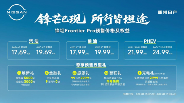 电车之家获悉,郑州日产旗下全新车型锋坦Frontier Pro将于11月27日正式上市。此前该车已经开启预售,共推出6款配置车型,其中锋坦Frontier Pro汽油版和柴油版价格在17.69万-19.99万元,PHEV版本则为21.99万-24.99万元。