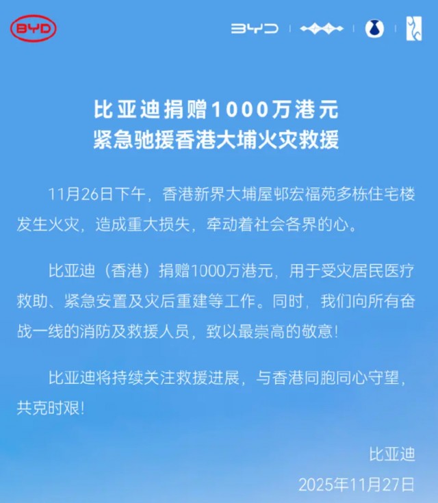 日前,比亚迪发布消息比亚迪将捐赠1000万港元,紧急驰援香港大埔火灾救援。比亚迪(香港)捐赠1000万港元,用于受灾居民医疗救助、紧急安置及灾后重建等工作。同时,我们向所有奋战一线的消防及救援人员,致以最崇高的敬意。比亚迪将持续关注救援进展,与香港同胞同心守望共克时艰。