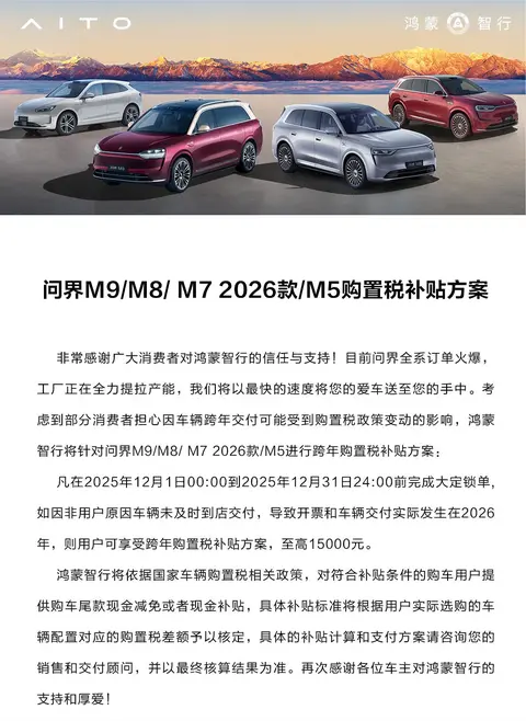电车之家获悉,问界汽车旗下问界M5、2026款问界M7、问界M8以及问界M9推出了跨年购置税补贴政策,用户在2025年12月31日24时前完成大定锁单,且因非用户原因车辆未及时到店交付,导致开票和车辆交付实际发生在2026年,则可享受至高15000元的补贴金额。