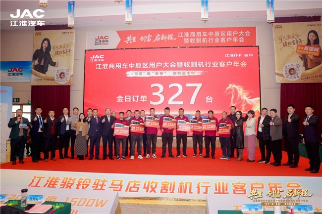 江淮1卡于2026年1月16日在河南驻马店举办的用户大会顺利闭幕。此次活动聚焦于收割机运输行业,现场发布了针对该场景升级的骏铃2026款系列车型,包括骏铃A9、骏铃V7、德沃斯Q8及德沃斯V8等。大会最终获得了327台的现场订单,展现了产品与市场需求的紧密契合。