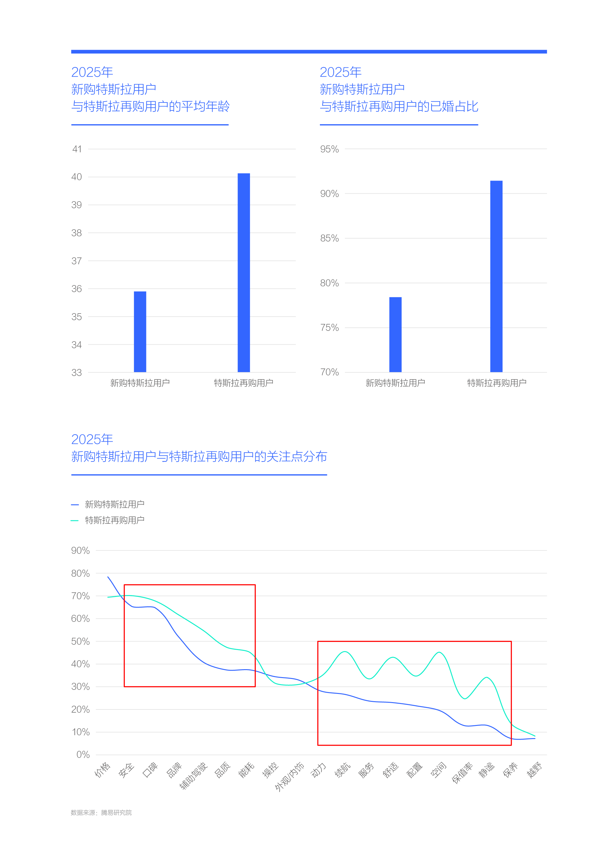 年龄、婚育等的较大区别,导致了新购特斯拉用户与特斯拉再购用户的购车关注点也有较大差异:以中青年用户为主的新购特斯拉用户最关注价格,以中年家庭为主的特斯拉再购用户最关注安全,且整体关注度要高,对空间、舒适、静谧、续航等的关注更突出;