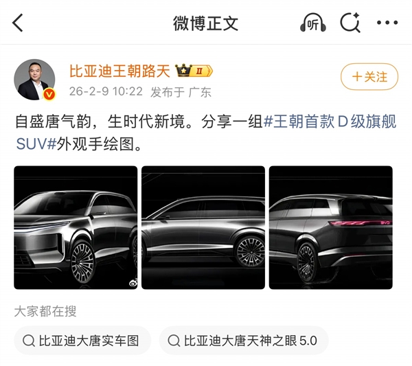 比亚迪大唐将搭载比亚迪顶尖的新能源核心技术、"天神之眼"高阶辅助驾驶系统以及智能座舱交互体系,凭借全方位的配置打造全场景出行体验,精准覆盖从"小家庭"到"大家庭"的多元化用车需求。作为比亚迪冲击高端大型新能源SUV市场的关键车型,大唐不仅填补了品牌在D级SUV领域的产品空白,同时为消费者带来全新的高端车型选择,将进一步搅动高端新能源大型SUV的市场格局。