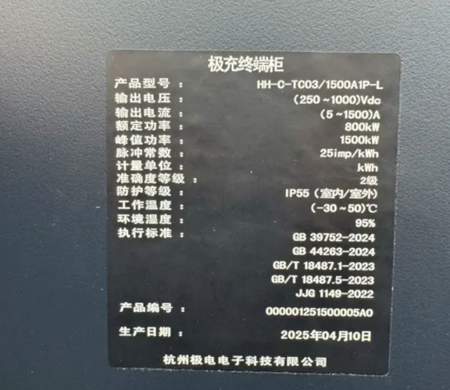 从充电桩硬件参数来看,吉利极充兆瓦桩(型号 HH-C-TC03/1500A1P-L)的输出电压范围为 250-1000Vdc,峰值电流可达 1500A,额定功率 800kW,峰值功率 1500kW,防护等级达 IP55,可适应 - 30~50℃的宽温域环境,完全满足不同地区、不同气候条件下的充电需求。其执行的 GB/T 18487.5-2023、GB39752-2024 等最新行业标准,也确保了充电过程的安全性与兼容性。