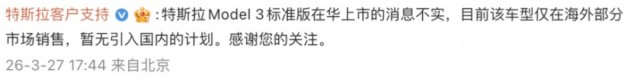 有爆料称,特斯拉已在上海超级工厂建成Model 3标准版产线,即将在中国市场推出。 针对此事,@特斯拉客户支持 在特斯拉官博评论区回复网友提问称,特斯拉Model 3标准版在华上市的消息不实,目前该车型仅在海外部分市场销售,暂无引入国内的计划。