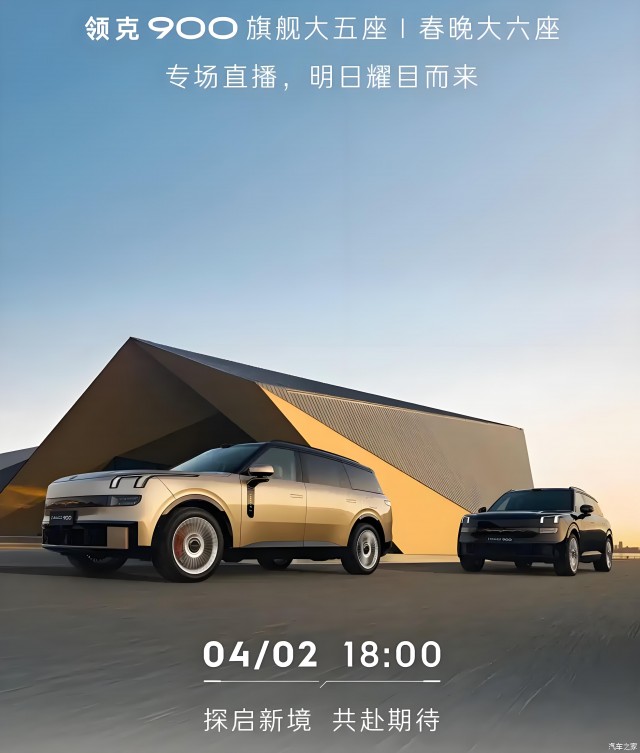电车之家获悉,领克900五座版将于4月2日上市。五座版车型将新增日冕金车色,同时二排也将提供舒适的电动调节座椅。