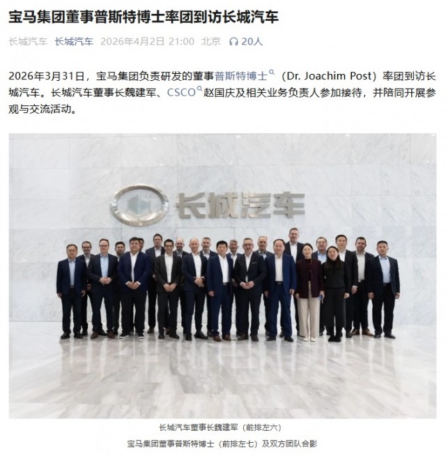 在技术中心,双方围绕光束汽车相关情况及部分技术议题进行了沟通交流。普斯特博士与魏建军董事长举行会谈,就中国市场发展、合作方向及有关事项交换意见。长城汽车与宝马集团在2018年达成合作,共同投资成立光束汽车有限公司,这是宝马集团首个纯电动车合资项目,也是长城汽车推进新能源国际化布局的重要举措。合作以来,光束汽车项目稳步推进,从工厂建设到首款车型量产下线取得阶段性成果。此次访问进一步增进了双方了解、深化技术互信,双方将继续本着互利共赢原则,探索在技术研发、产业协同等领域的合作机会,推动共同发展。