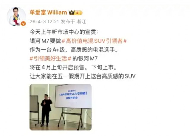 日前,电车之家获悉吉利汽车传播策略部长,吉利银河公关部长单爱富在个人社交媒体平台上表示,“吉利银河M7将于4月上旬开启预售,下旬上市,让大家能在五一假期开上(交付)”。