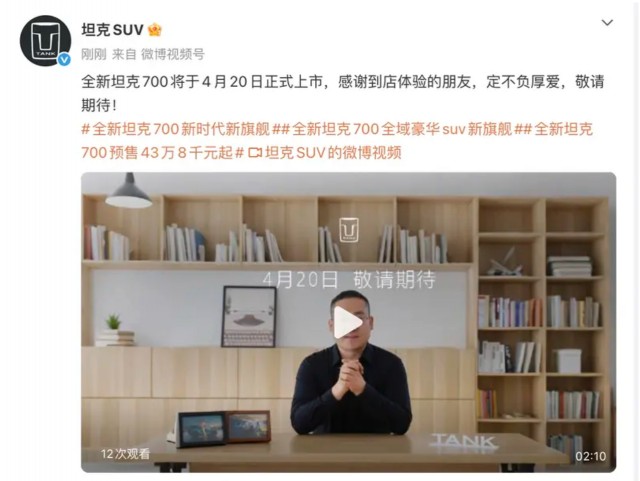 日前,电车之家获悉长城坦克官方发布消息,全新坦克700将于4月20日上市。全新坦克700已在3月30日开启预售,预售价区间43.8-51.8万元。