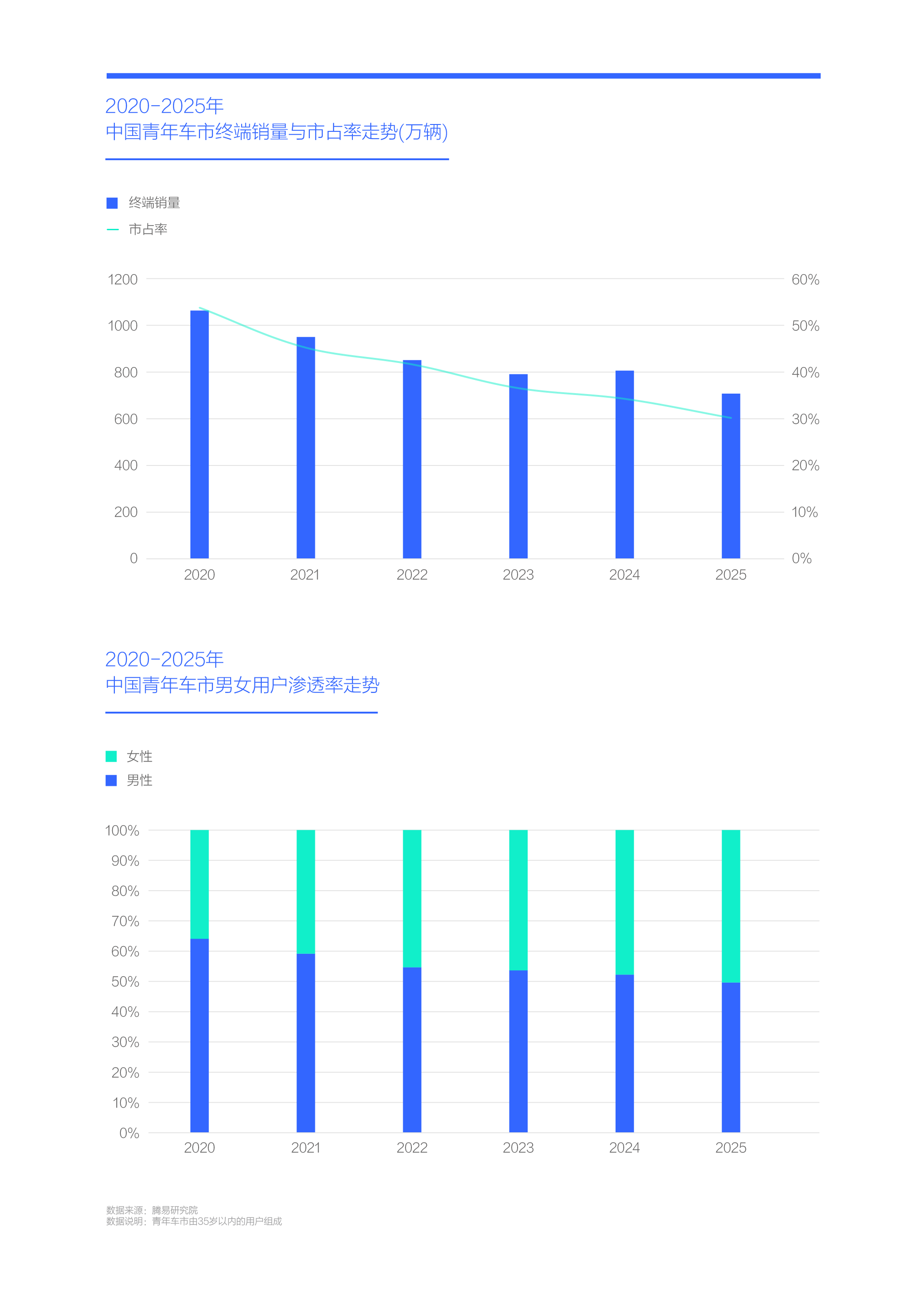 2020-2025年,中国各年龄段的青年车市都在萎缩,且消费主力都向女性转移,车市越年轻女性渗透率提升越显著
