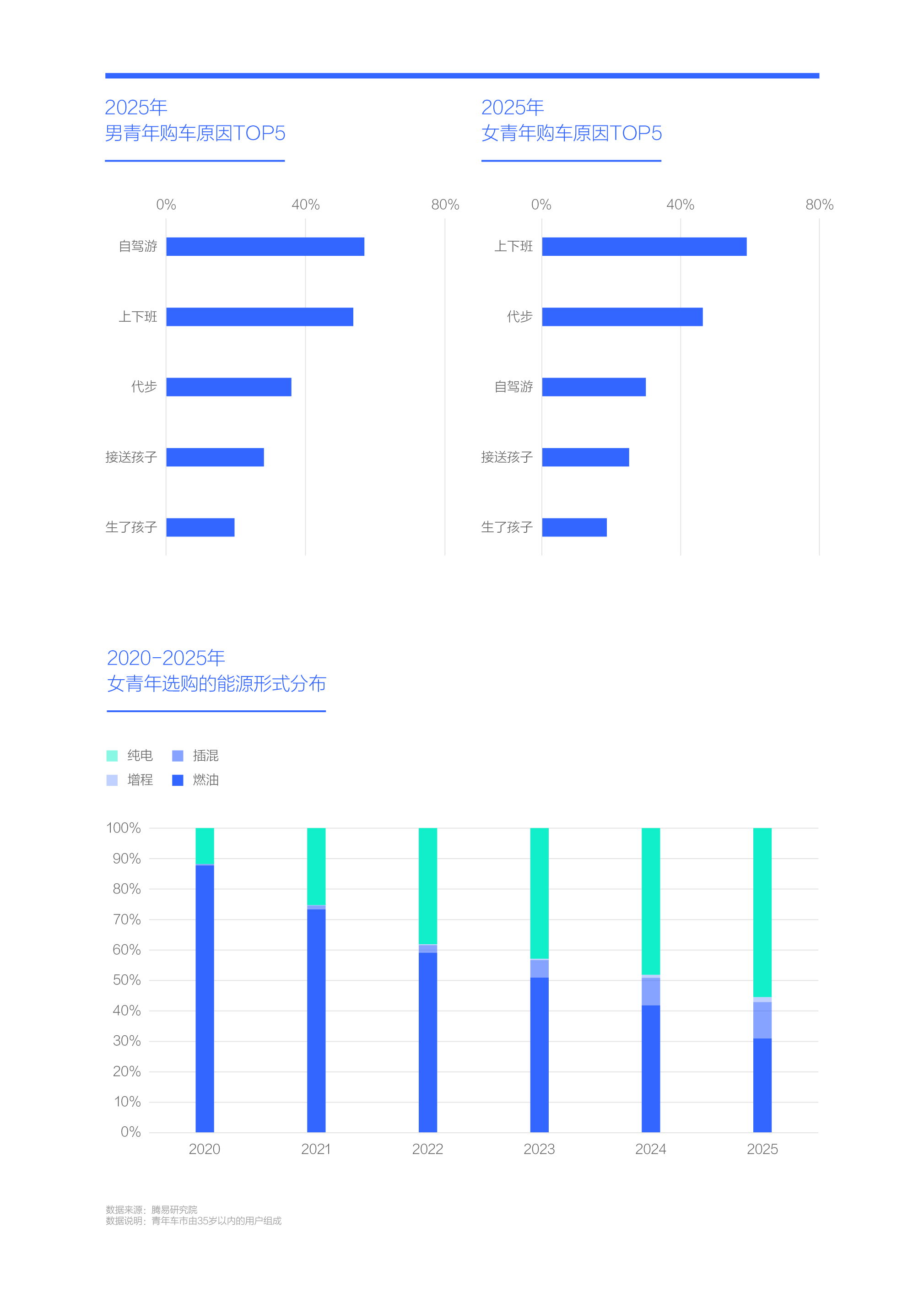 上下班与代步场景属于典型的城市型用车,线路较短且相对固定,该场景能更好包容电动车的易掉电、补能耗时长等缺点,更易发挥电动车的经济、环保、智能、静谧等优点。由于女青年用车聚焦城市型场景,意味着与城市场景相得益彰的电动车能更好吸引女青年用户。2020-2025年,女青年选择电动车的比例越来越高,纯电占比由不足12%飙升至55%;