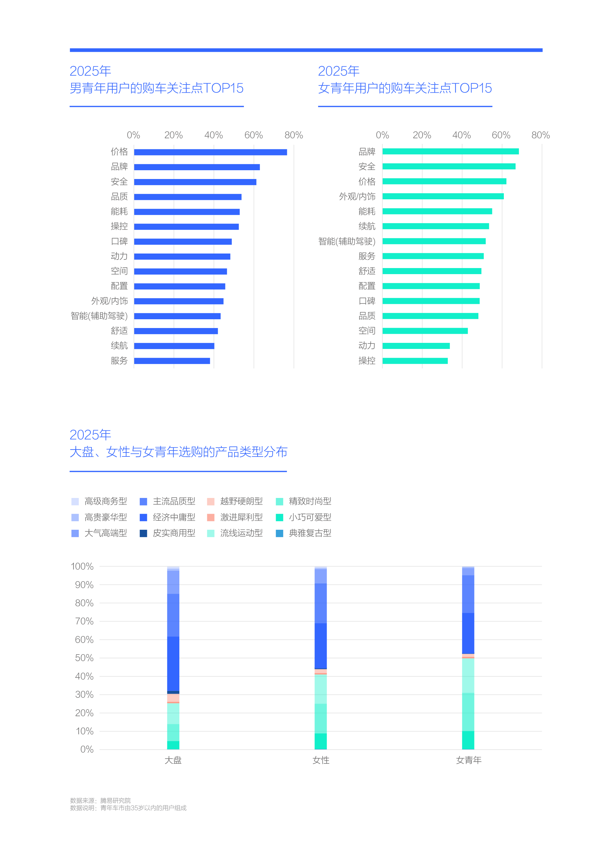 2025年男女青年购车关注点TOP3都是价格、品牌与安全,只是前后顺序不同,较大差异点在TOP3之外。女青年对造型、智能、续航、服务等的关注明显高于男青年,但对动力、操控等的关注远不如男青年,意味着女青年可能会成为助推车企电气化、智能化等核心战略的关键群体;