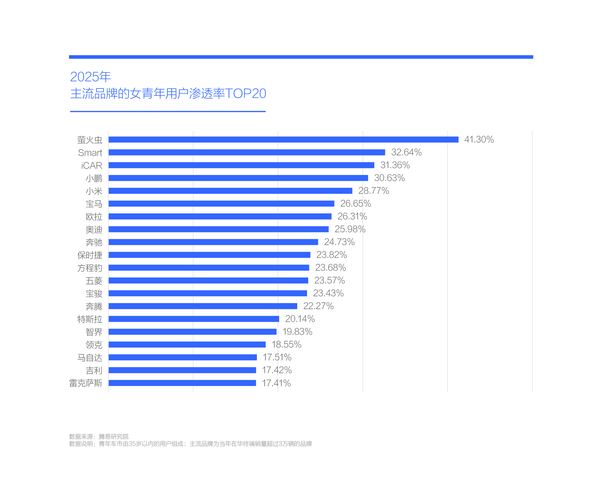 2020-2025年,中国青年车市快速萎缩,同时女性成为青年车市的新主力,渗透率迅速突破50%,让多数车企以男性为主的传统型年轻化战略凸显尴尬