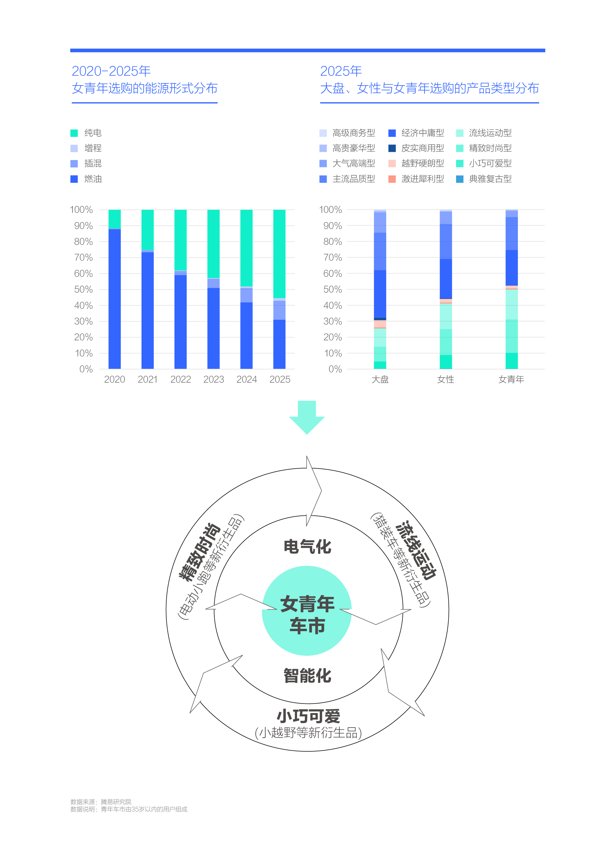 2020-2025年,快速主导青年车市的女青年用户,更关注颜值、智能、续航、服务等卖点,更偏好小巧可爱、精致时尚与流线运动等颜值型潮品,更聚焦城市代步,更偏好纯电产品……基于上述特征,女青年正成为普及电气化、智能化等技术路线,和挖掘小巧可爱、精致时尚与流线运动等个性化产品市场潜力的关键力量;