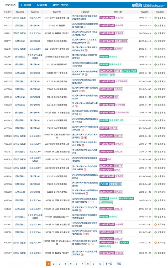 销量急剧下滑之下,质量问题同时也在缠绕沃尔沃,沃尔沃主力车型 XC60 、S90、XC90等车型屡遭投诉。