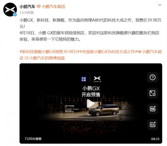 4月15日,小鹏汽车旗下首款全尺寸豪华SUV——小鹏GX正式启动预售,预售价定为39.98万元起。根据官方规划,全国范围内的展车将于4月18日起陆续到店。车身尺寸方面,小鹏GX的长宽高分别为5265mm、1999mm和1800mm,轴距达到3115mm。车内采用2+2+2的六座布局.智能驾驶辅助方面,小鹏GX搭载了源自Robotaxi的全栈自研技术,配备四颗自研图灵AI芯片,综合算力达3000TOPS。