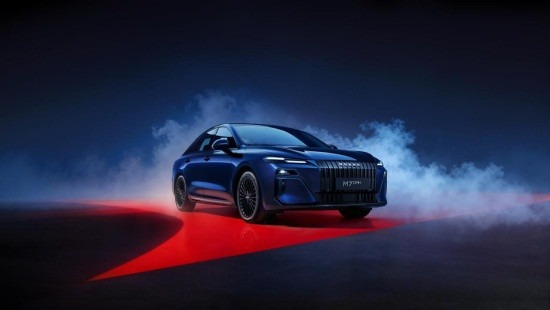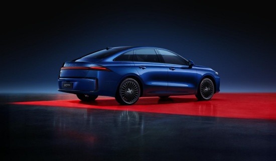 外观造型部分,荣威 M7 DMH 黑马版由前劳斯莱斯设计总监约瑟夫・卡班操刀,整体采用原厂黑武士风格,搭配专属八层蓝黑高定车漆,暗光沉稳玄黑、强光泛出炫蓝光泽,质感出众。整车配备全维黑化套件,熏黑直瀑格栅、外后视镜、车窗饰条及轮毂均做黑化处理,无多余镀铬点缀,搭配低趴溜背车身与硬朗腰线,车尾贯穿式熏黑尾灯进一步强化运动气场,再加上后排高遮光隐私玻璃,整体造型低调高级又极具辨识度。