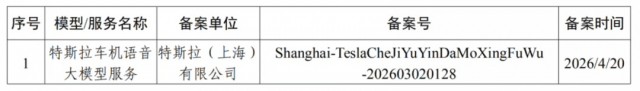 据网信上海消息发布的生成式人工智能服务已备案信息公告显示,特斯拉车机语音大模型服务于 4 月 20 日备案,备案单位为特斯拉(上海)有限公司。 据介绍,已上线的生成式人工智能应用或功能,应在显著位置或产品详情页面公示所使用已备案生成式人工智能服务情况,注明模型名称及备案号,并根据《人工智能生成合成内容标识办法》添加生成合成内容标识。